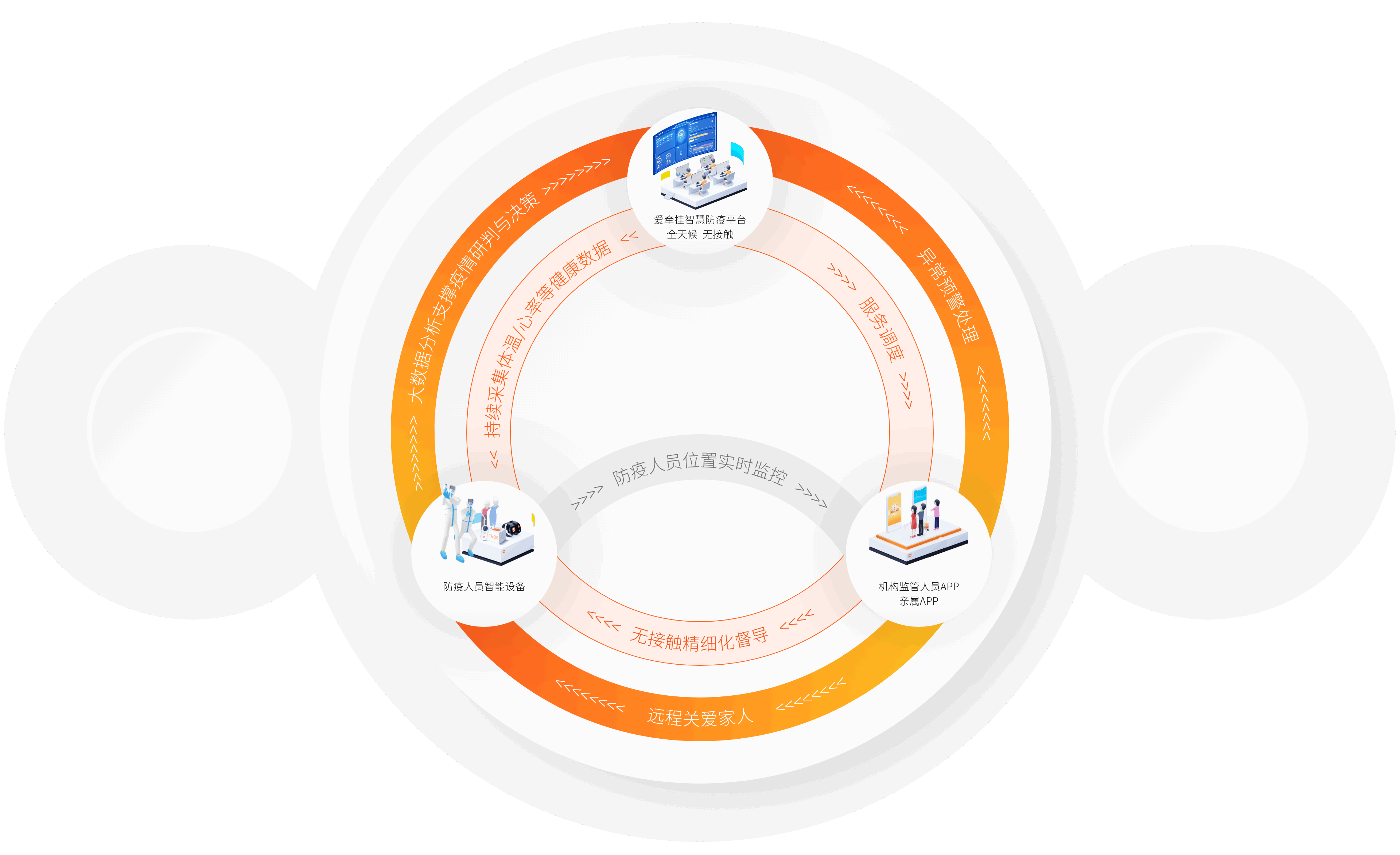采用爱牵挂自研的多形态智慧防疫硬件针对居家隔离、全天无接触测体温、人员位置追踪、防疫政策广播等多个关键场景设计,疫情数据实时跟踪、远程传输、自动即时上报,大幅降低各地防疫单位人员人力的同时,极大的减少防疫人员交叉感染风险