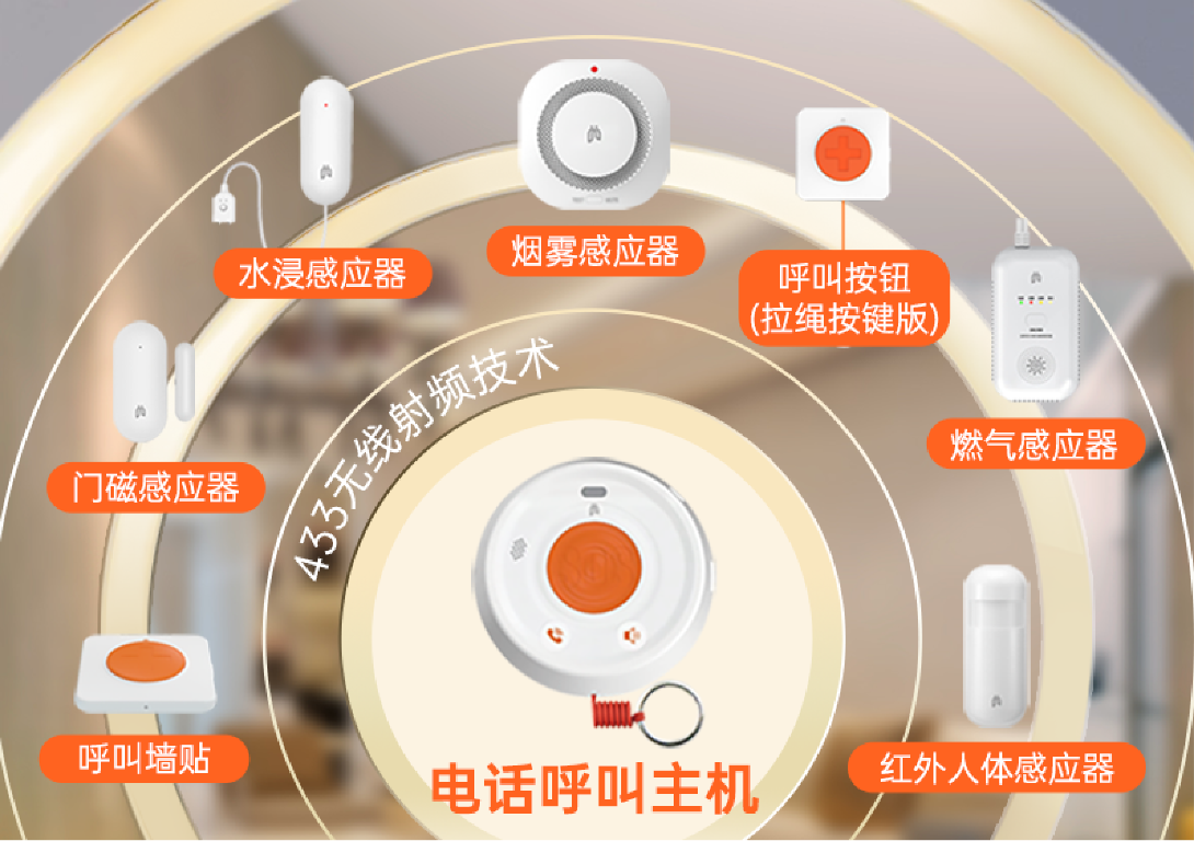 HA07X性能升级,拓展性强,通过采用433无线射频通讯技术,除了能够实现呼叫主机与多个呼叫按钮/墙贴的连接外,还支持主机搭配门磁/燃气/水浸/烟雾感应器等家床项目套装的智能终端监测产品联动使用,有效覆盖长者居家养老不同活动场景。