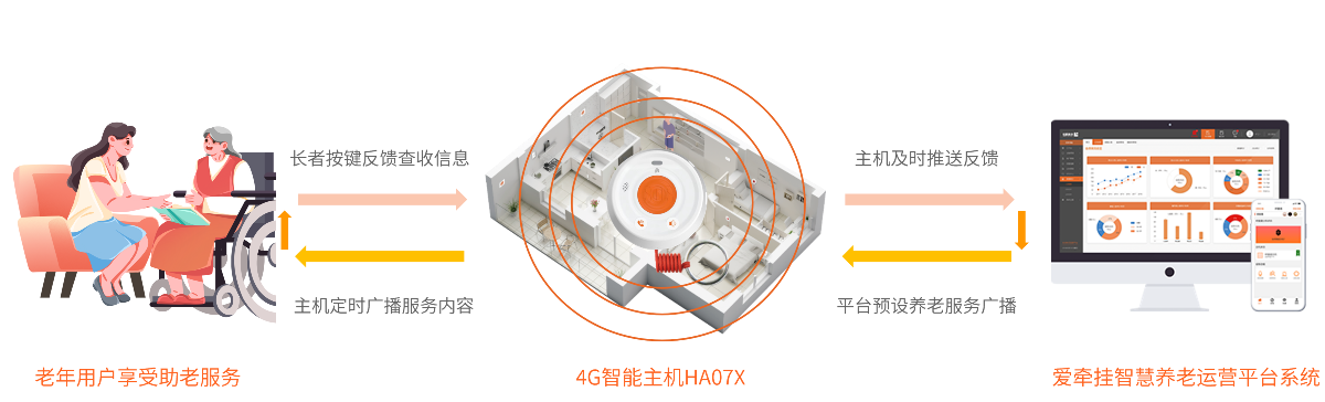 搭配使用爱牵挂智慧养老平台系统,一方面,服务机构可自定义预设服务广播推送信息,如助医/助餐/助行/助洁、生活配备、文体娱乐、应急救援、探访关爱等助老服务通知,助推机构深化落地服务内容,提升运营效率。另一方面,用户也能通过按下呼叫器主机按钮确认服务信息,升级居家养老服务体验。
